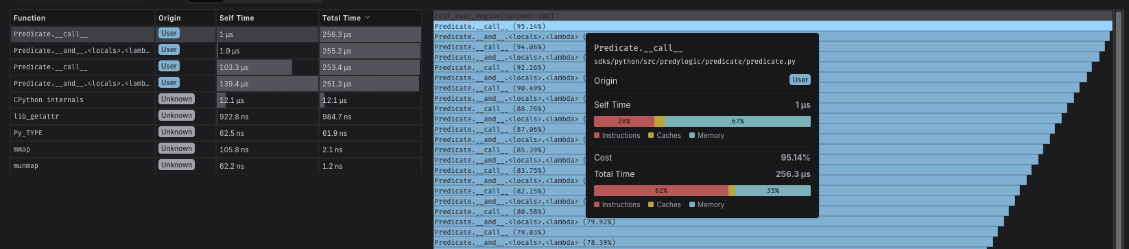 - Observation: CPU profiling shows execution time is dominated by stack management rather than actual logic evaluation.