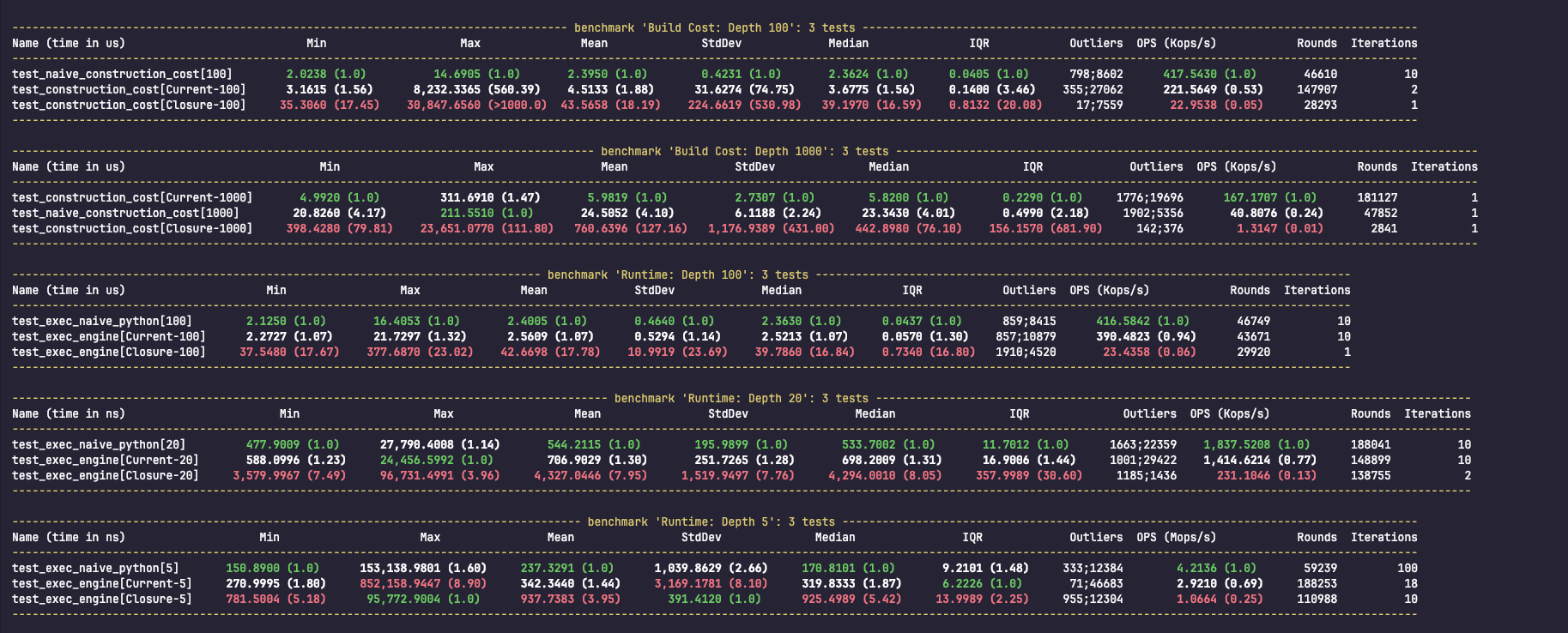 - Build Performance: At depth 1000, Current is 4x faster than handwritten Python and 127x faster than Closure (eliminates O(N²) tuple copying).